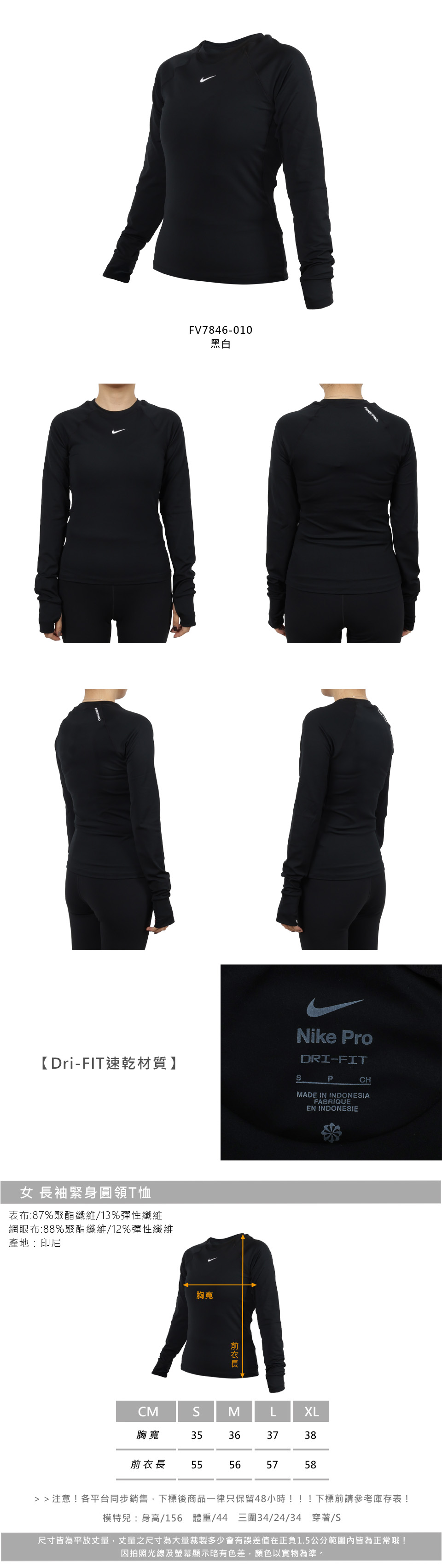 NIKE 女款長袖緊身圓領T恤  FV7846-010 - 黑白