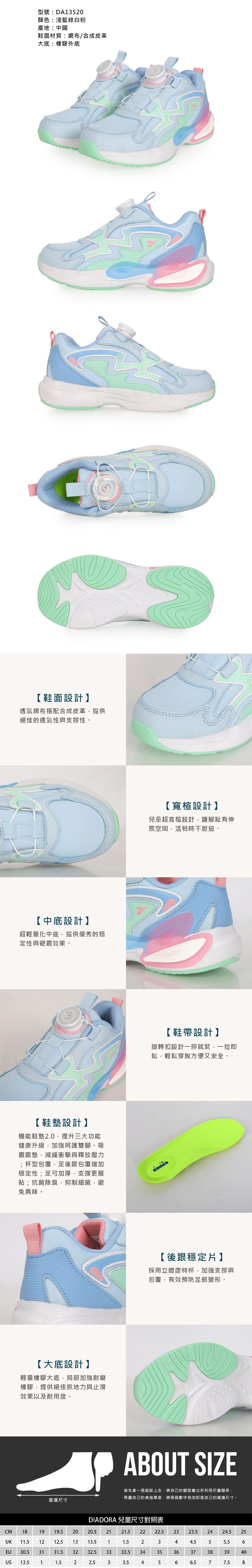DIADORA 中童騎士轉扣時尚慢跑鞋-超寬楦  DA13520 - 淺藍綠白粉