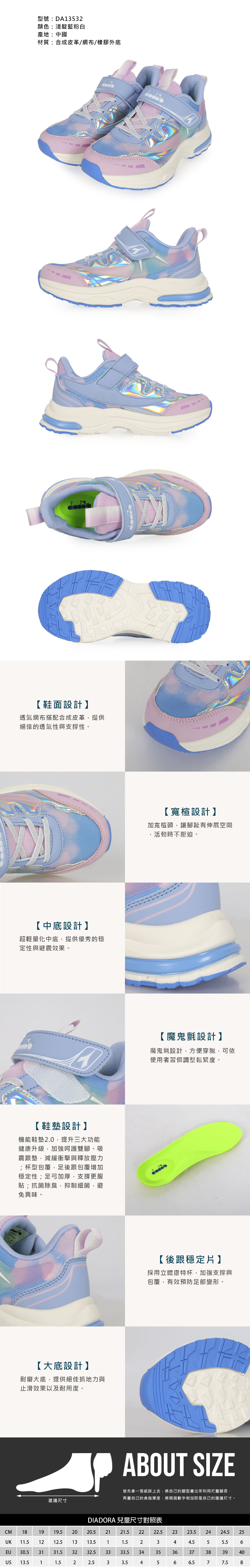 DIADORA 中童幻速輕量慢跑鞋-超寬楦  DA13532 - 淺靛藍粉白