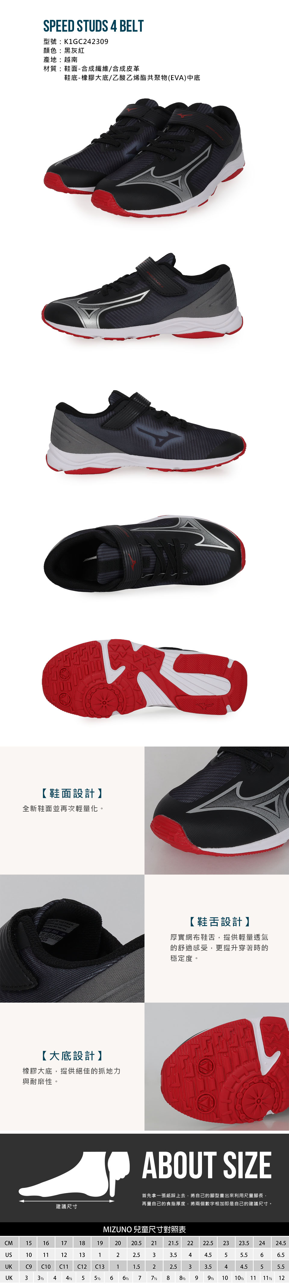 MIZUNO 大童慢跑鞋   @SPEED STUDS 4 BELT@ K1GC242309 - 黑灰紅