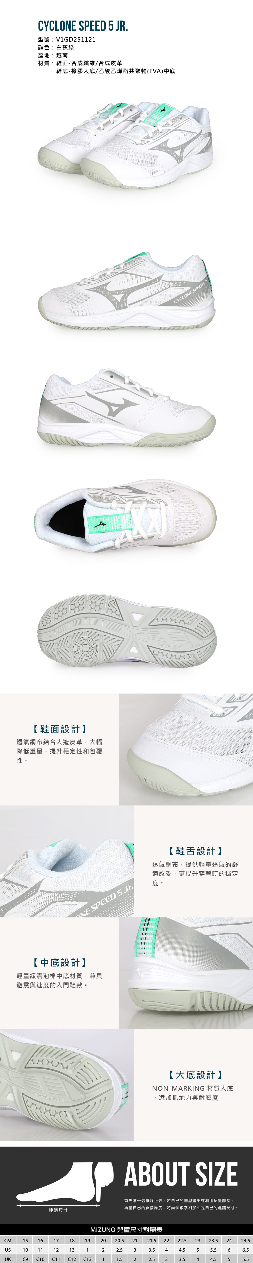 MIZUNO 兒童排球鞋  @CYCLONE SPEED 5 Jr.@ V1GD251121 - 白灰綠