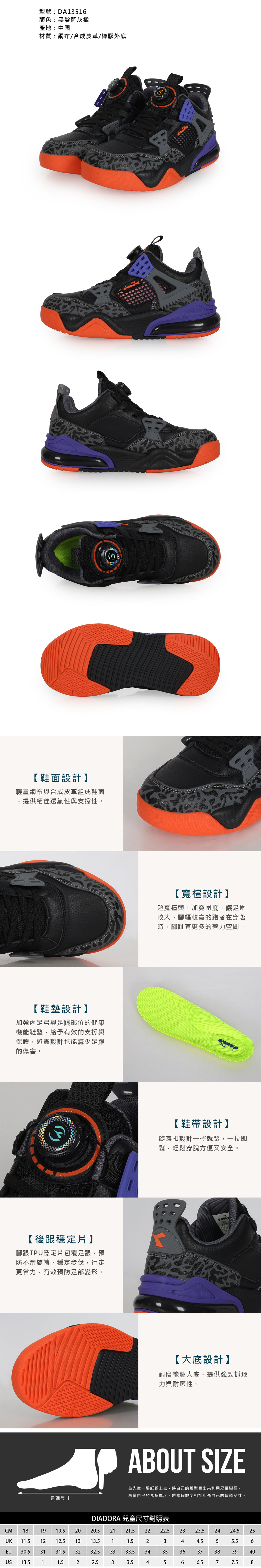 DIADORA 大童陸戰隊轉扣籃球鞋-超寬楦  DA13516 - 黑靛藍灰橘