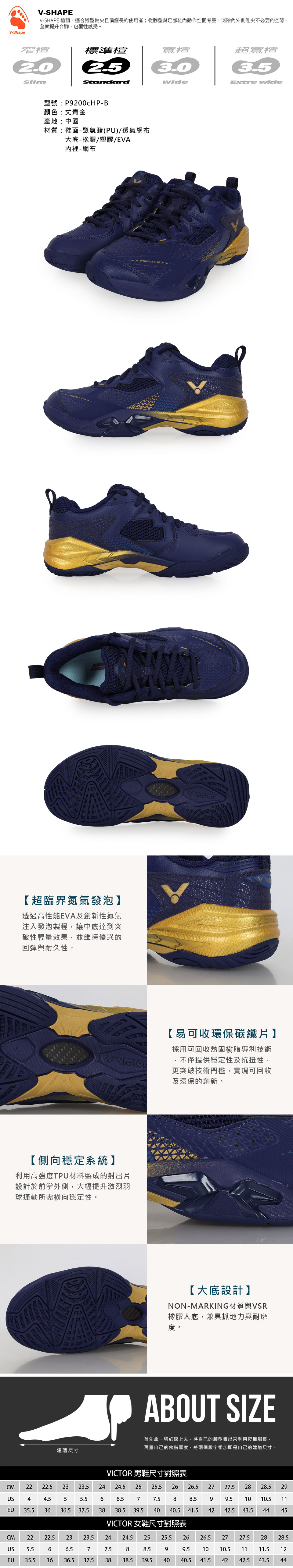 VICTOR 男女款專業羽球鞋-3E  P9200cHP-B - 丈青金