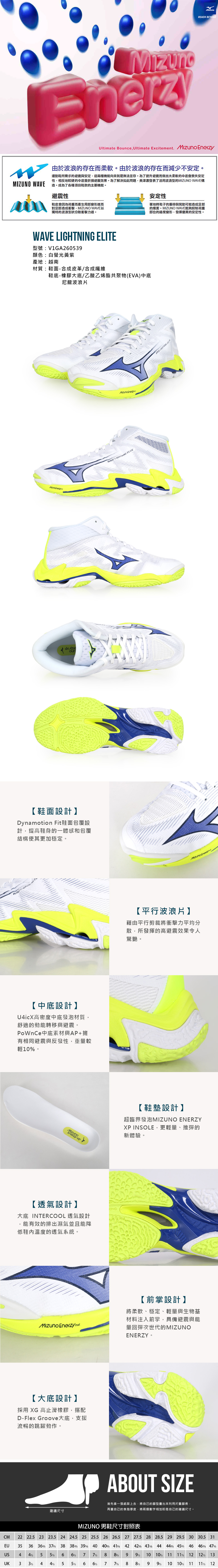 MIZUNO 男款排球鞋  @WAVE LIGHTNING ELITE@ V1GA260539 - 白螢光黃紫