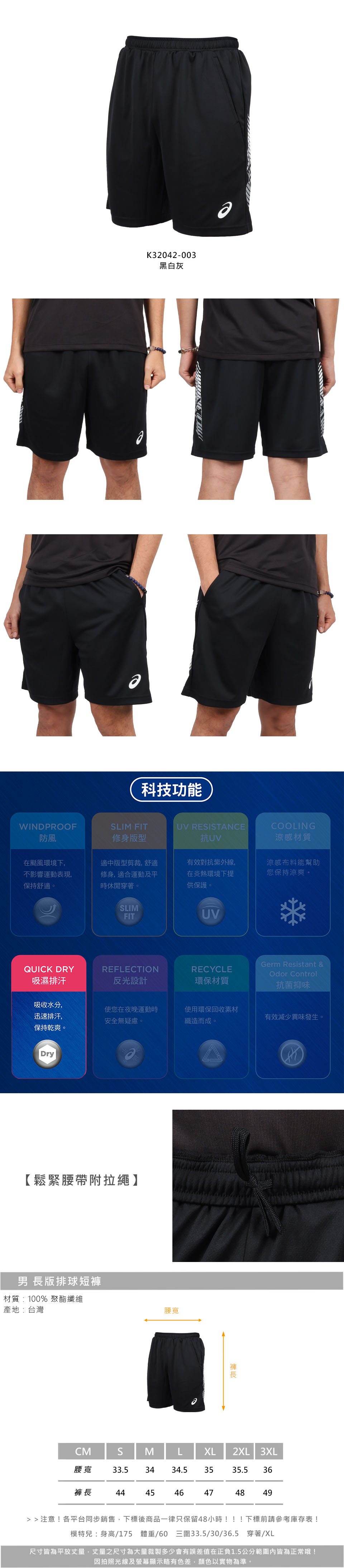 ASICS 男款長版排球短褲  K32042-003 - 黑白灰