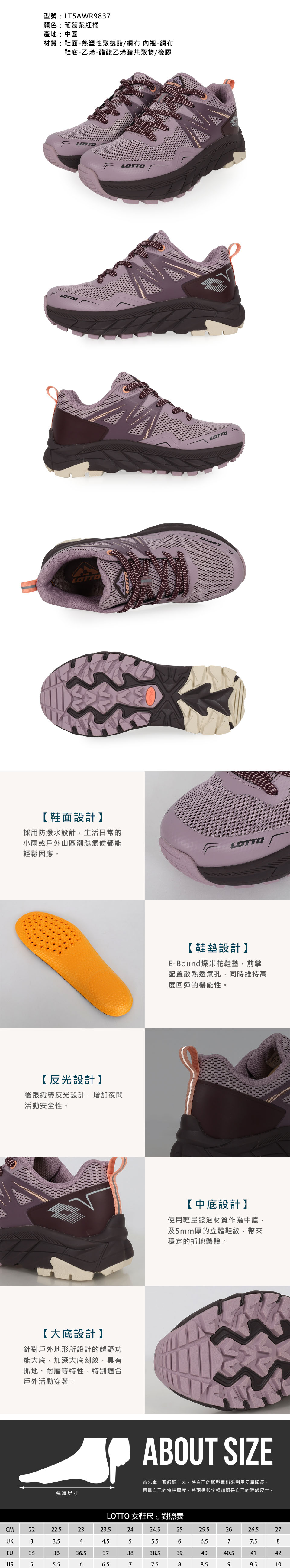 LOTTO 女款防潑水戶外健行鞋  LT5AWR9837 - 葡萄紫紅橘