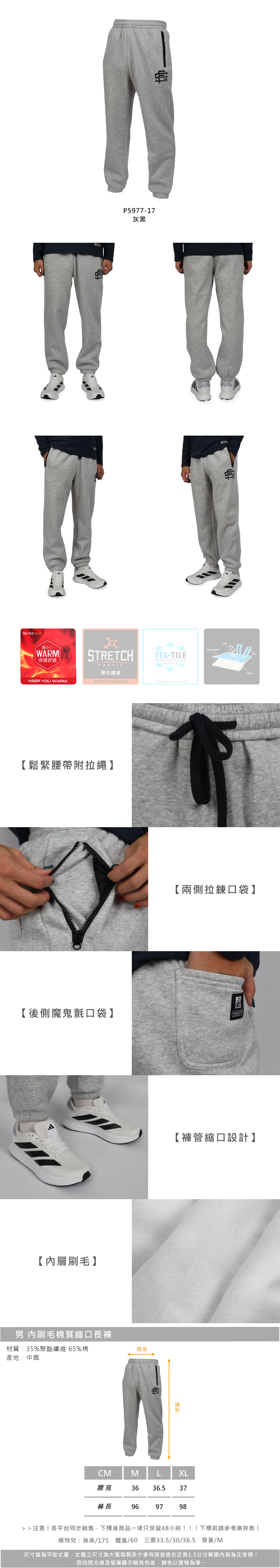 FIRESTAR 男款內刷毛棉質縮口長褲  P5977-17 - 灰黑