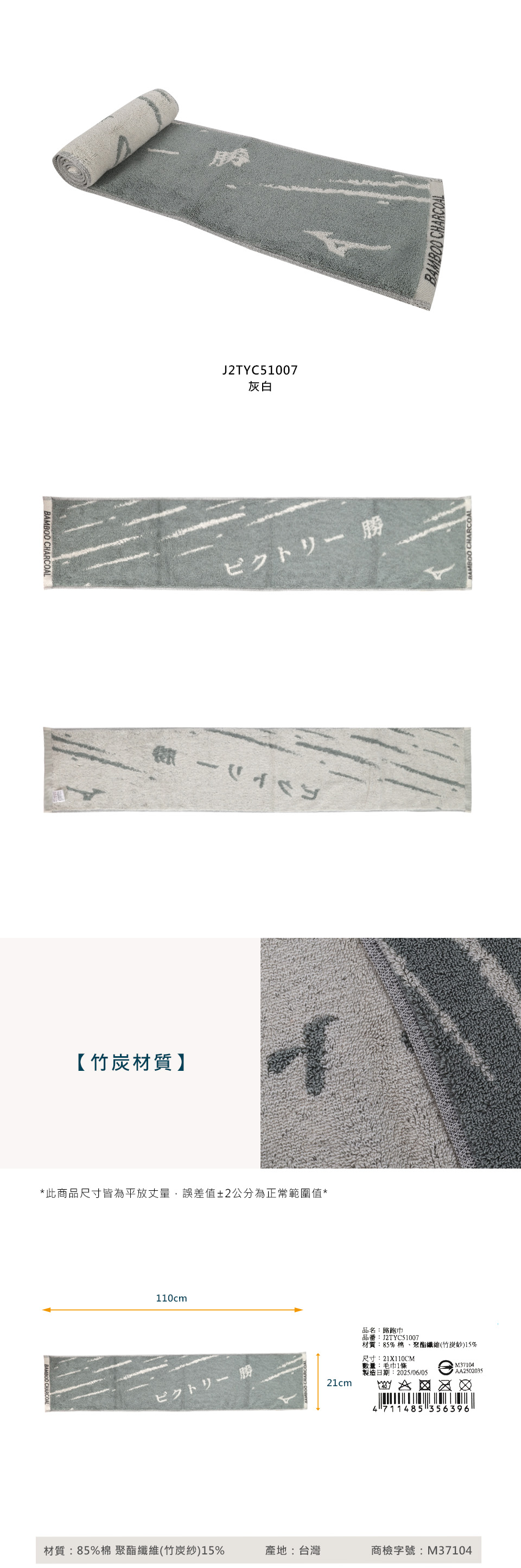 MIZUNO 竹炭提花路跑毛巾 J2TYC51007