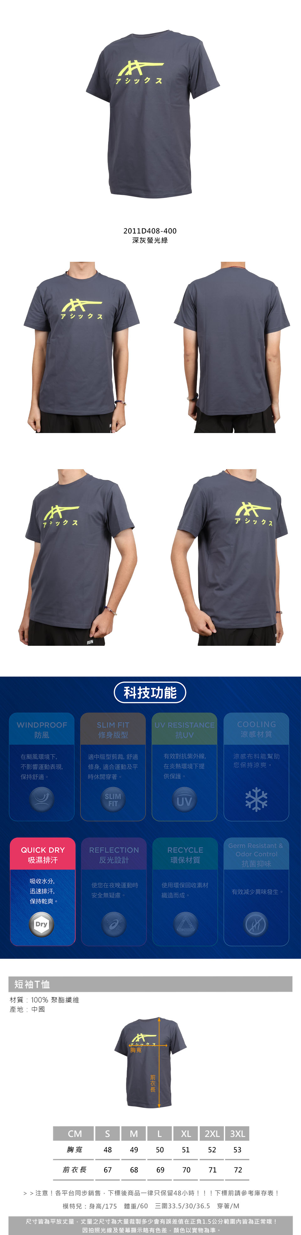 ASICS 短袖T恤  2011D408-400 - 深灰螢光綠
