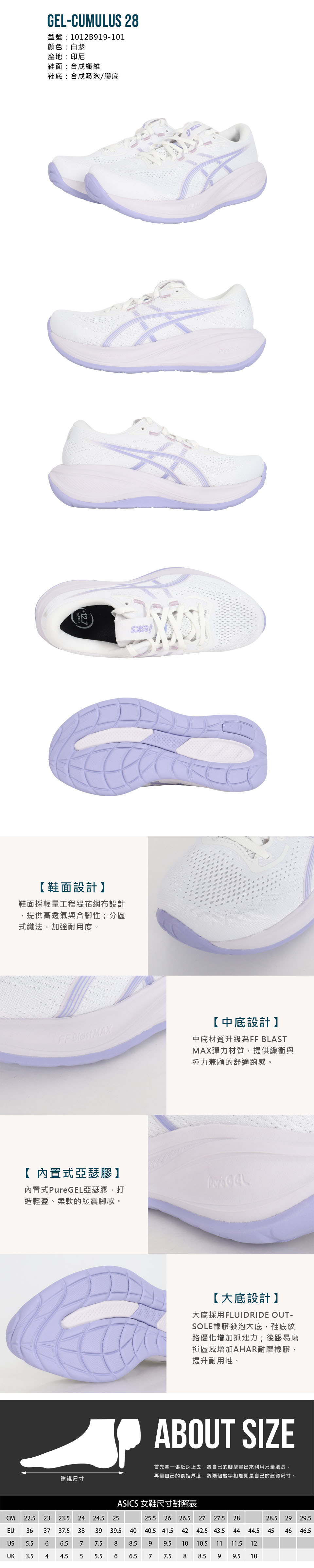 ASICS 特定-女款緩震慢跑鞋  @GEL-CUMULUS 28@ 1012B919-101 - 白紫