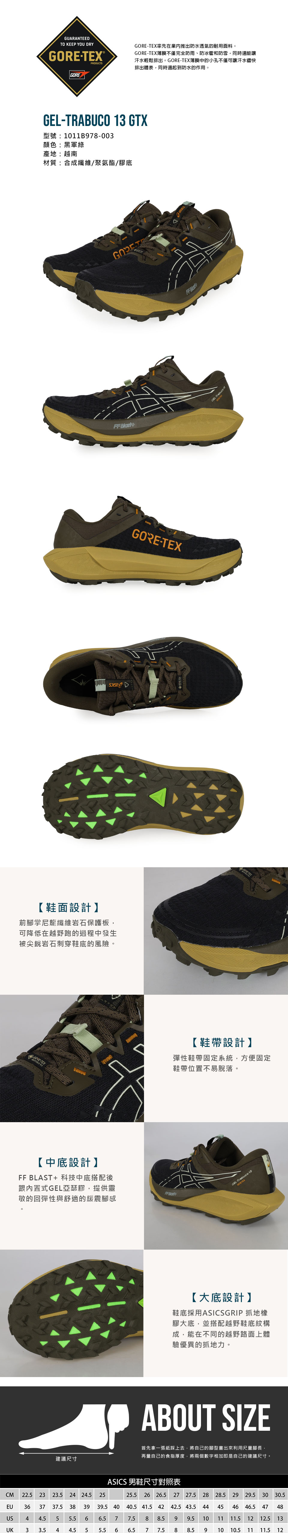 ASICS 男款防水越野跑鞋  @GEL-Trabuco 13 GTX@ 1011B978-003 - 黑軍綠