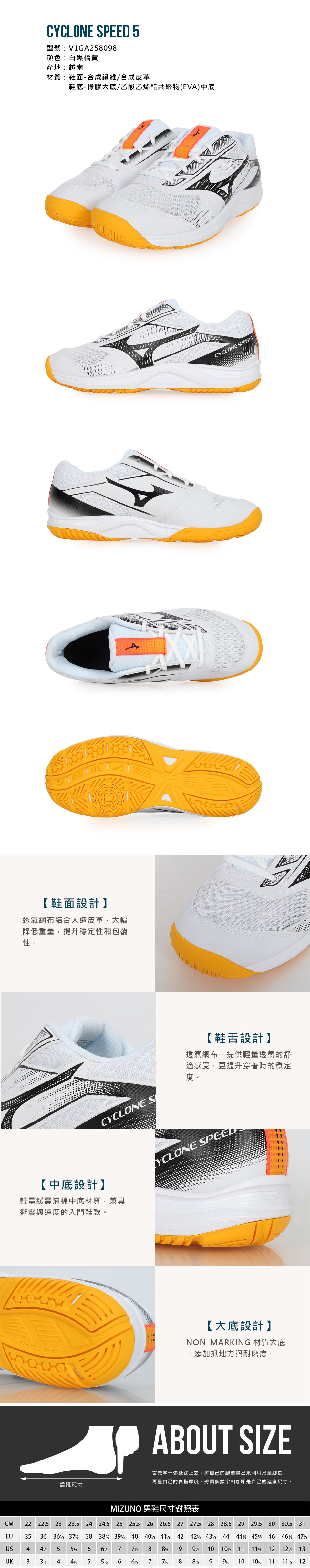 MIZUNO 男款排球鞋  @CYCLONE SPEED 5@ V1GA258098 - 白黑橘黃