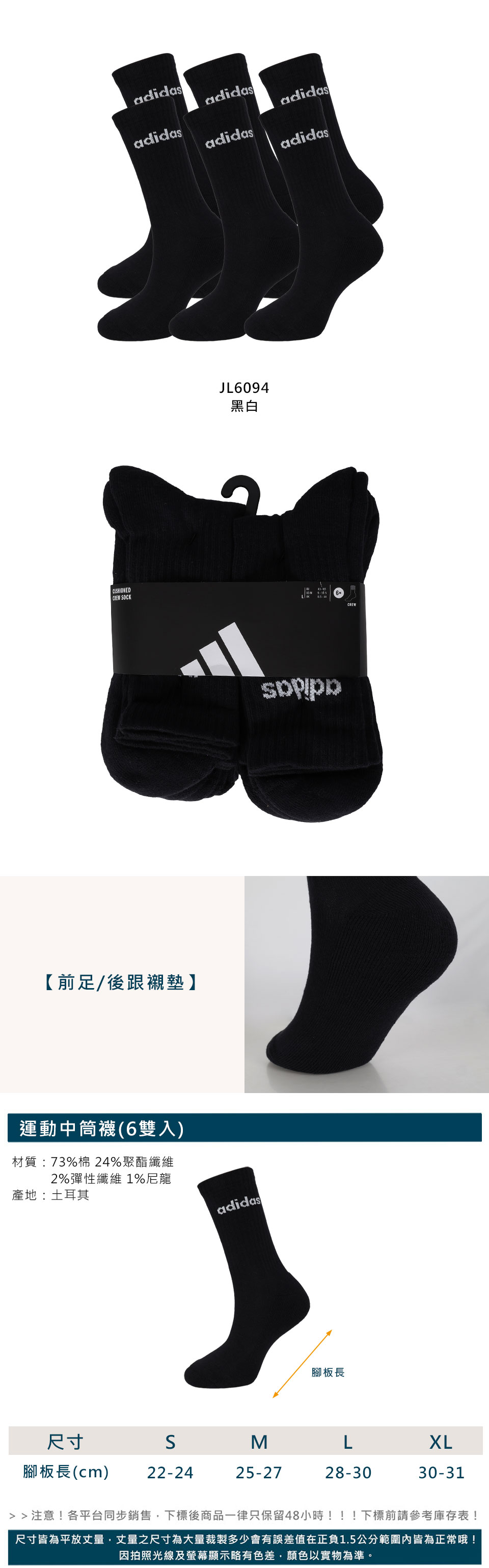 ADIDAS 運動中筒襪(6雙入)  JL6094