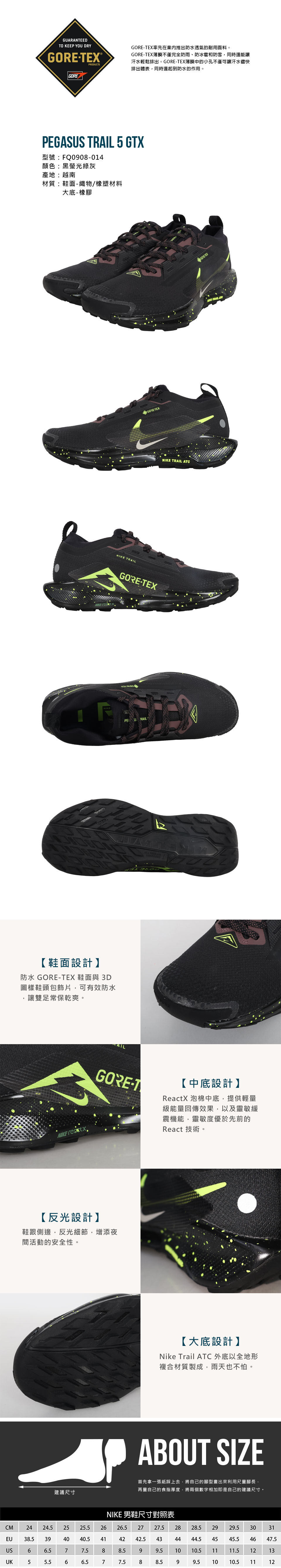 NIKE 男款防水越野跑鞋  @PEGASUS TRAIL 5 GTX@ FQ0908-014 - 黑螢光綠灰