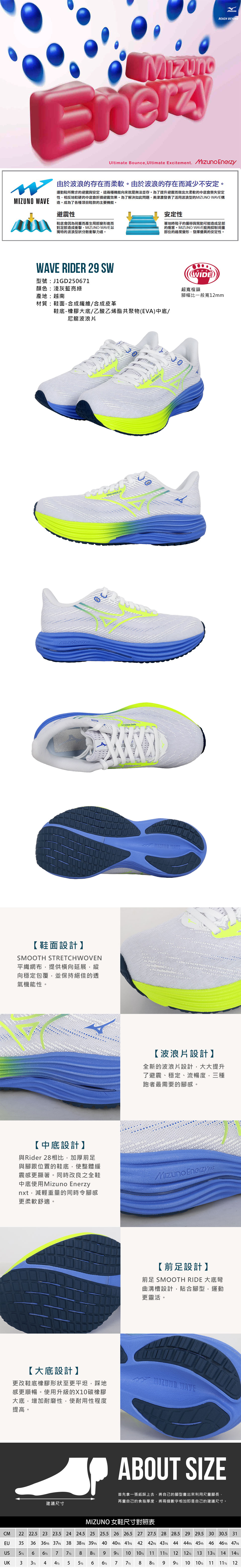 MIZUNO 女款慢跑鞋-4E  @WAVE RIDER 29 SW@ J1GD250671 - 淺灰藍亮綠
