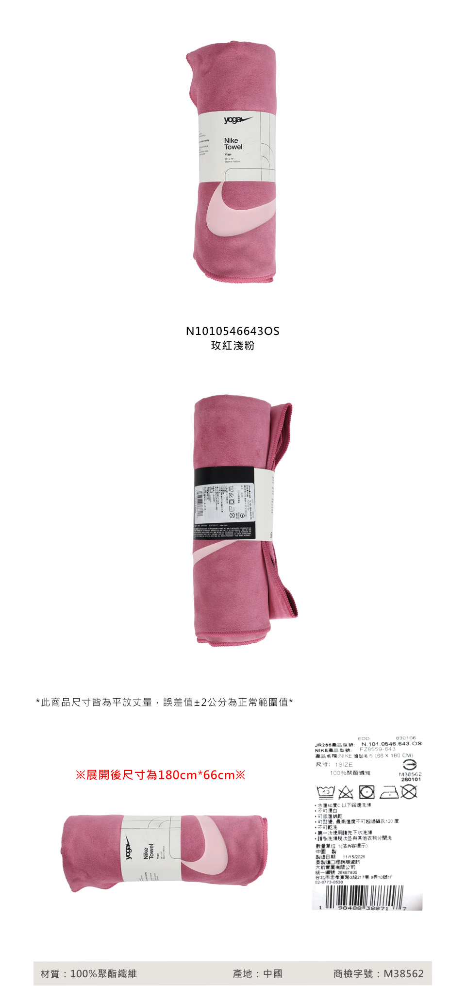 NIKE 瑜珈毛巾(66×180CM)  N1010546643OS - 玫紅淺粉