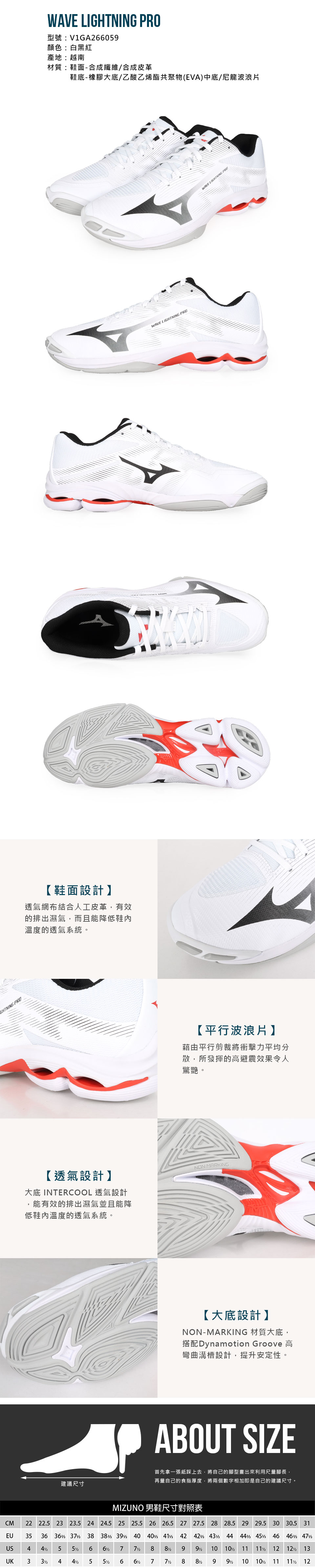 MIZUNO 男款排球鞋  @WAVE LIGHTNING PRO@ V1GA266059 - 白黑紅