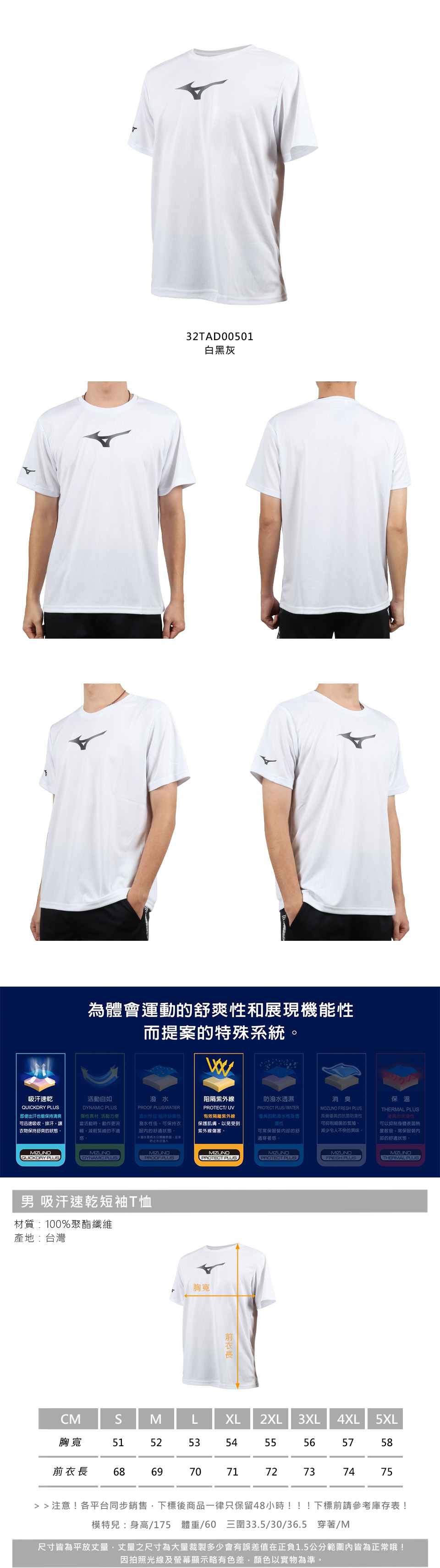 MIZUNO 男款吸汗速乾短袖T恤  32TAD00501 - 白黑灰