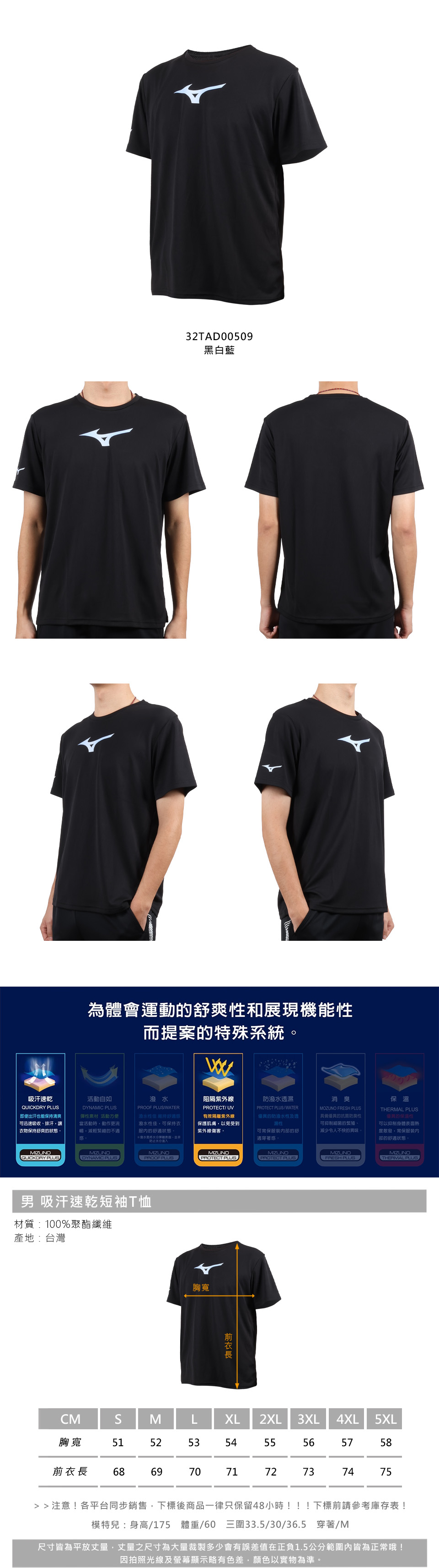 MIZUNO 男款吸汗速乾短袖T恤  32TAD00509 - 黑白藍