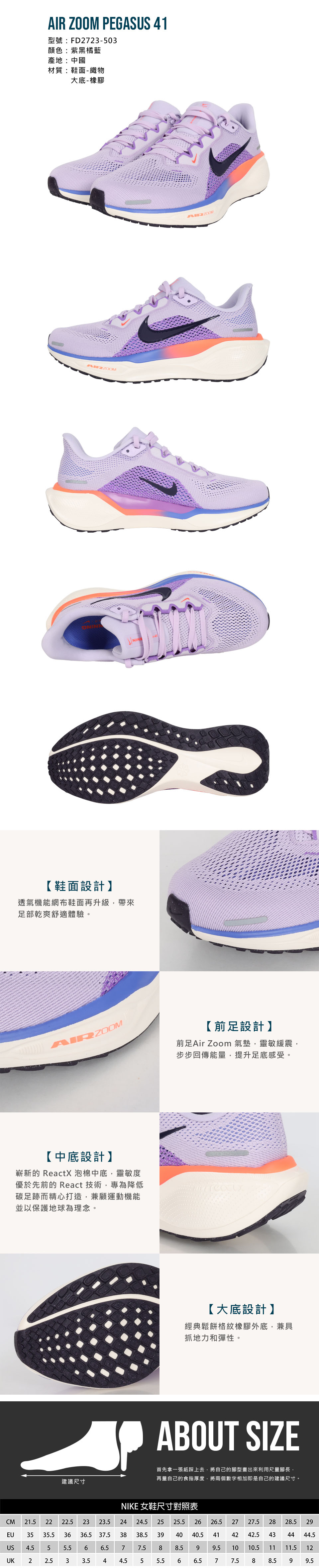 NIKE 女款慢跑鞋  @AIR ZOOM PEGASUS 41@ FD2723-503 - 紫黑橘藍