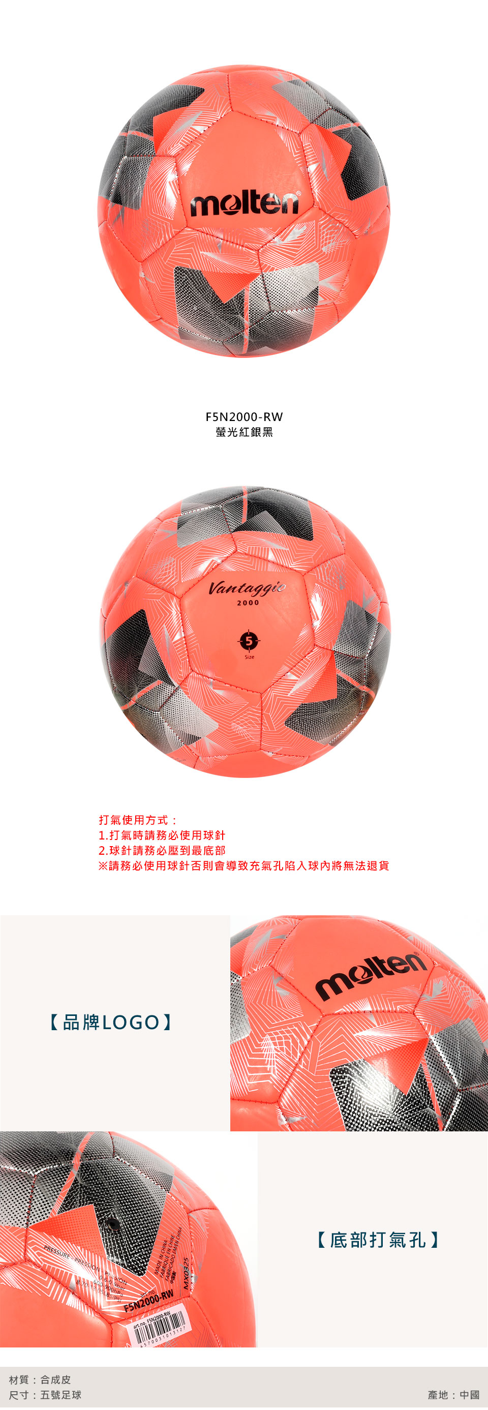 Molten #5合成皮足球  F5N2000-RW - 螢光紅銀黑