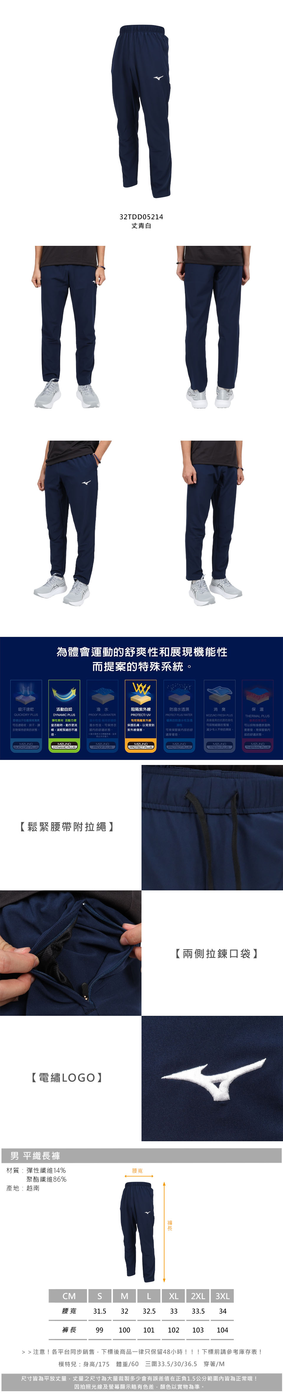 MIZUNO 男款平織長褲  32TDD05214 - 丈青白