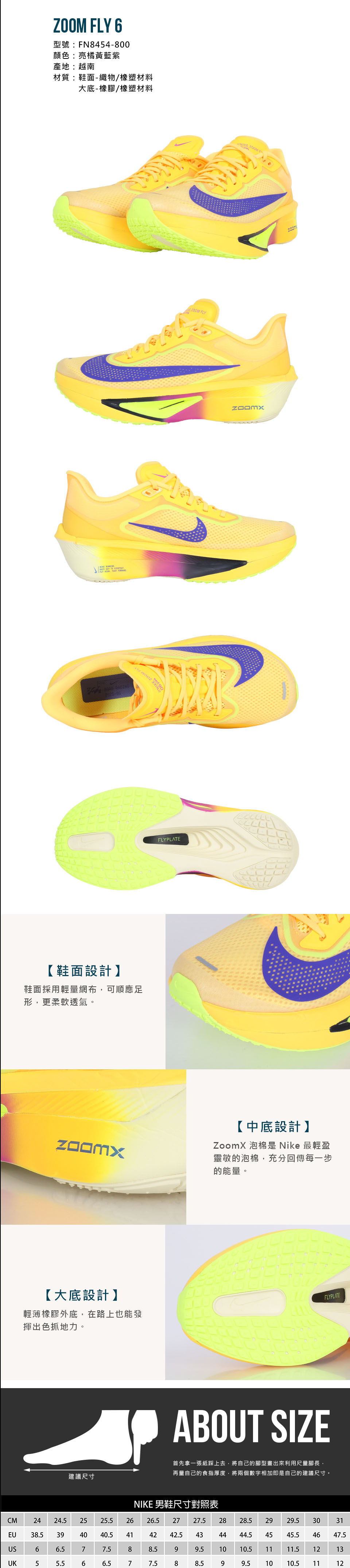 NIKE 男款競速跑鞋  @ZOOM FLY 6@ FN8454-800 - 亮橘黃藍紫