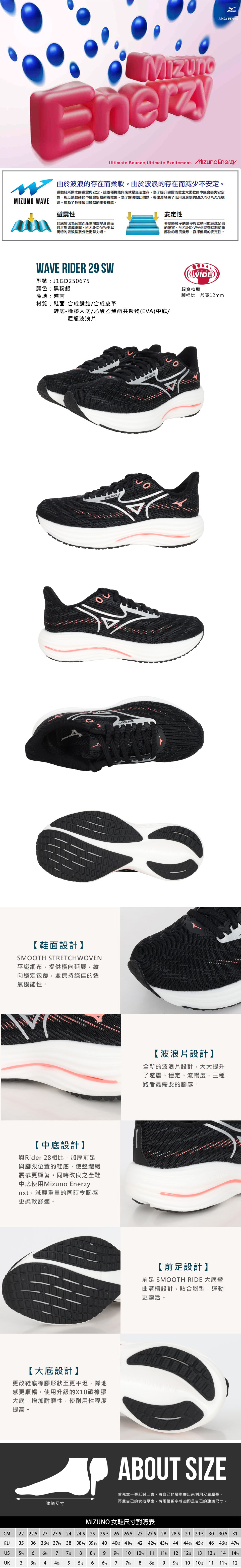 MIZUNO 女款慢跑鞋-4E  @WAVE RIDER 29 SW@ J1GD250675 - 黑粉銀