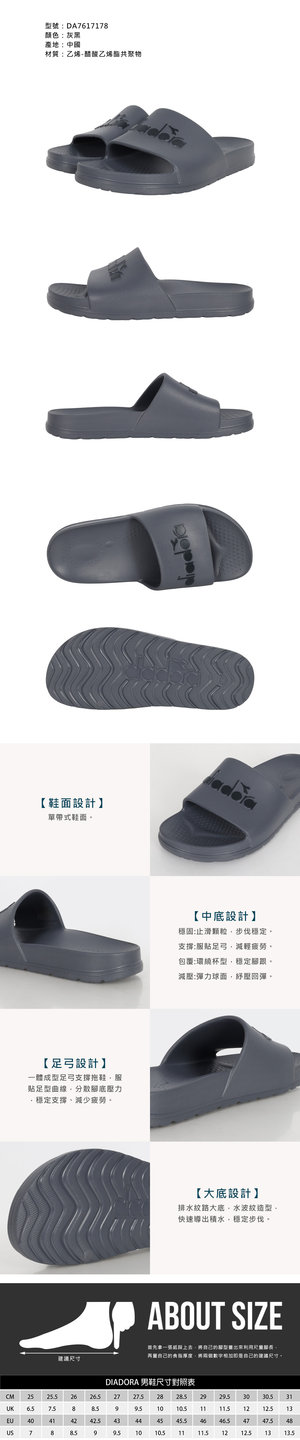 DIADORA 男運動拖鞋  DA7617178 - 灰黑