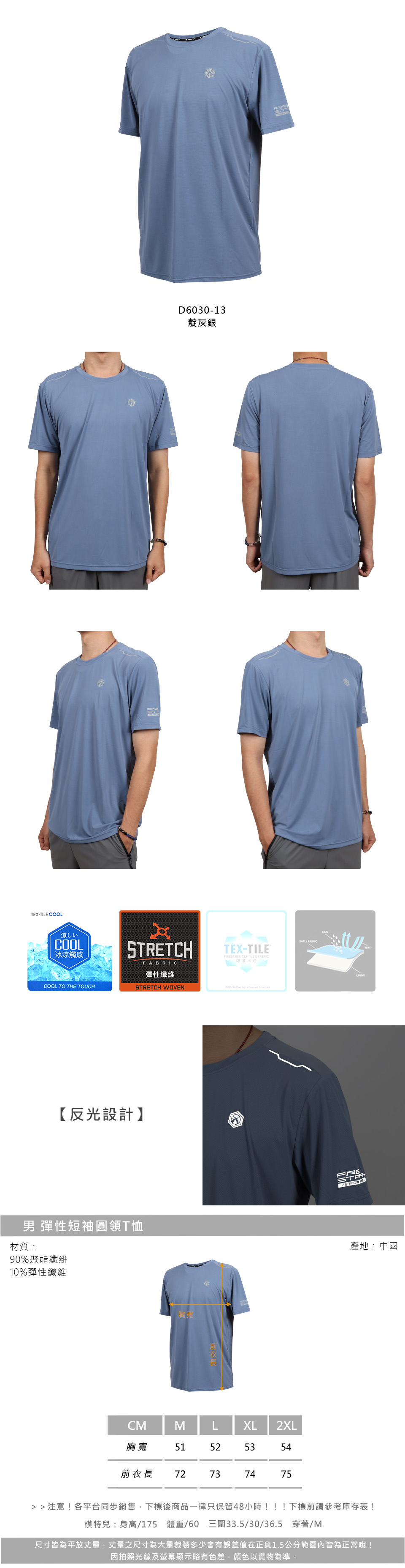 FIRESTAR 男款彈性短袖圓領T恤  D6030-13 - 靛灰銀