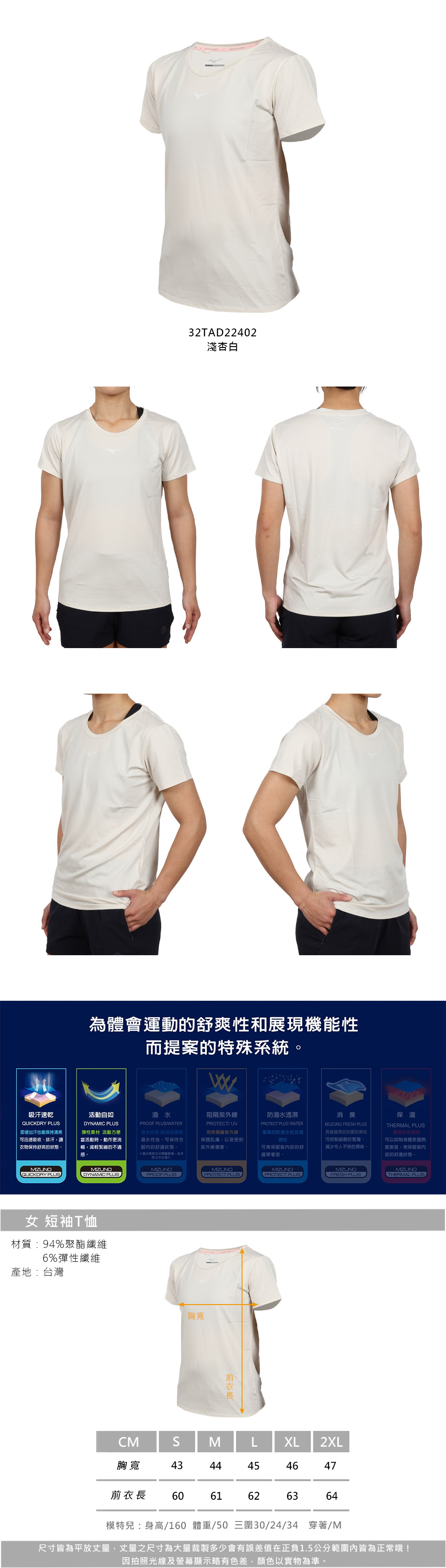 MIZUNO 女款短袖T恤  32TAD22402 - 淺杏白