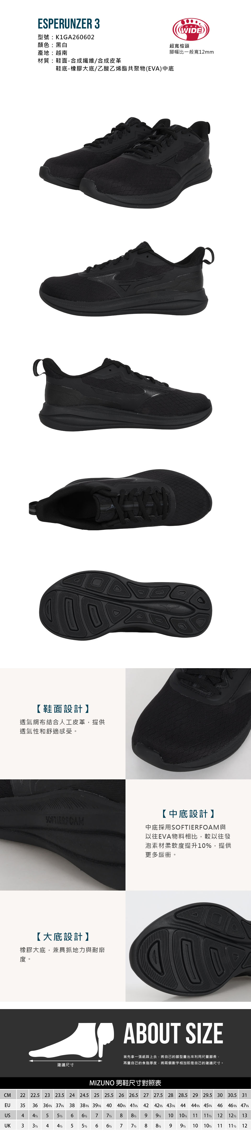 MIZUNO 男款慢跑鞋-4E  @ESPERUNZER 3@ K1GA260602 - 黑