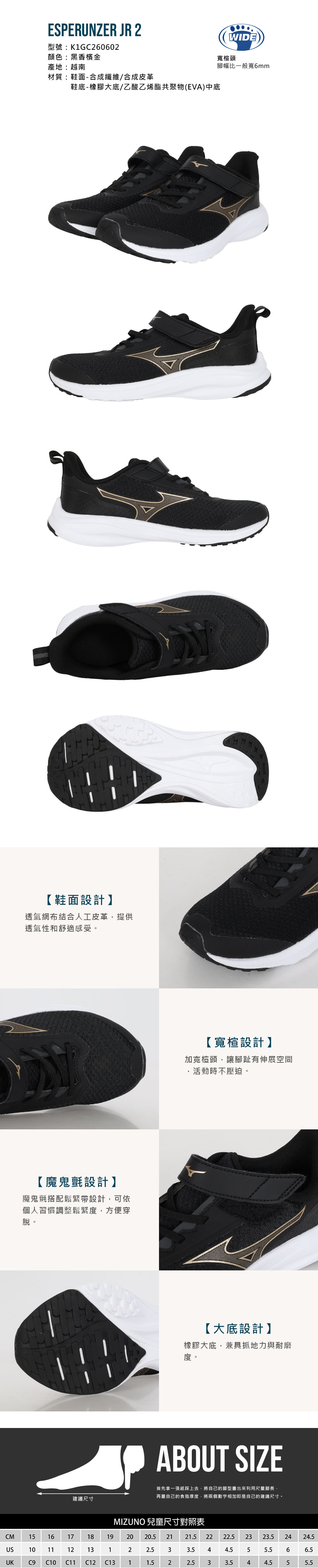 MIZUNO 大童運動鞋-3E  @ESPERUNZER Jr 2@ K1GC260602 - 黑香檳金