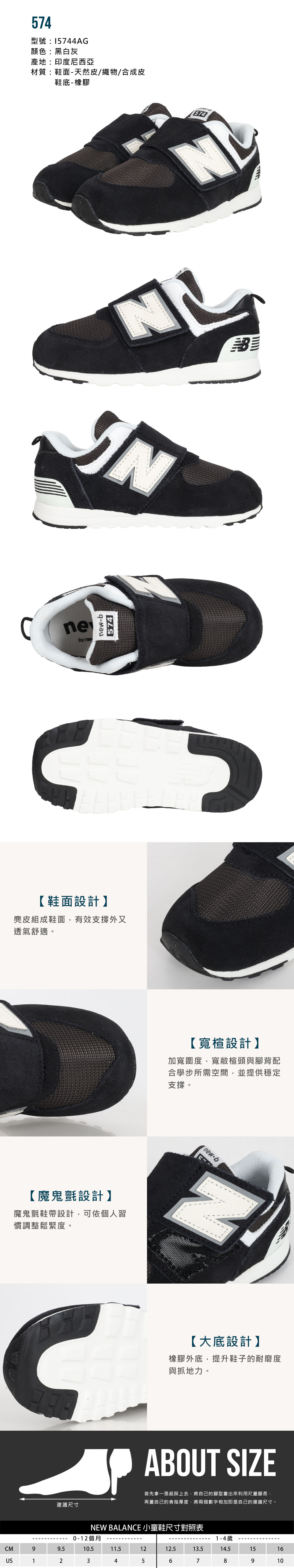 NEW BALANCE 小童復古慢跑鞋-WIDE  @574@ I5744AG - 黑白灰